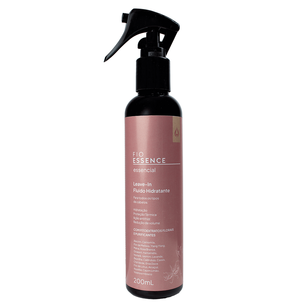 O Fluido Leave-in Essencial é um hidratante para cabelo em spray, sem enxágue, indicado para todos os tipos de fios que precisam de maciez, brilho e proteção diária. Sua fórmula vegana e orgânica combina Fitoextratos Purificantes e Florais (Chá-Verde, Lavanda e Capim-Limão) com filtros UV e proteção térmica até 230 °C, criando um escudo antifrizz que reduz o volume e mantém o alinhamento por mais tempo.